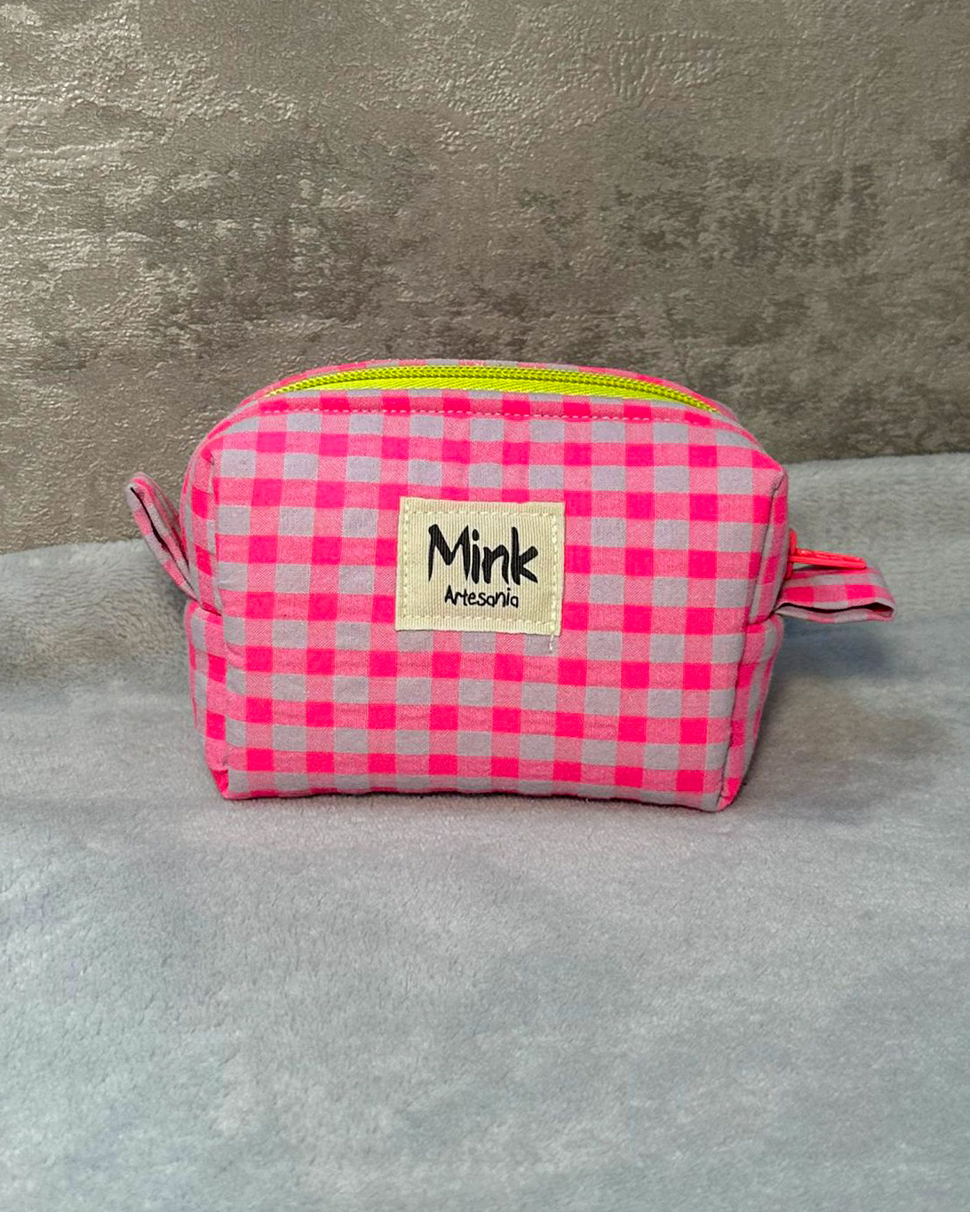 Estuche práctico y resistente a cuadros en tonos rosados, perfecto para llevar bolígrafos, maquillaje o pequeños accesorios siempre organizados. Su diseño compacto lo hace ideal para usar en el día a día, llevarlo en el bolso o en la mochila.