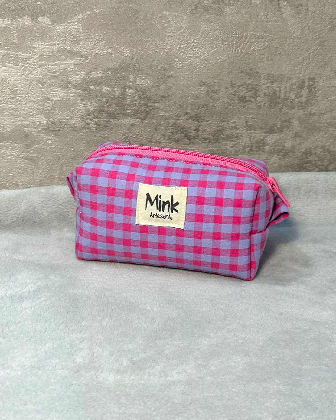 Estuche práctico y resistente a cuadros en tonos rosa y violeta, perfecto para llevar bolígrafos, maquillaje o pequeños accesorios siempre organizados. Su diseño compacto lo hace ideal para usar en el día a día, llevarlo en el bolso o en la mochila.