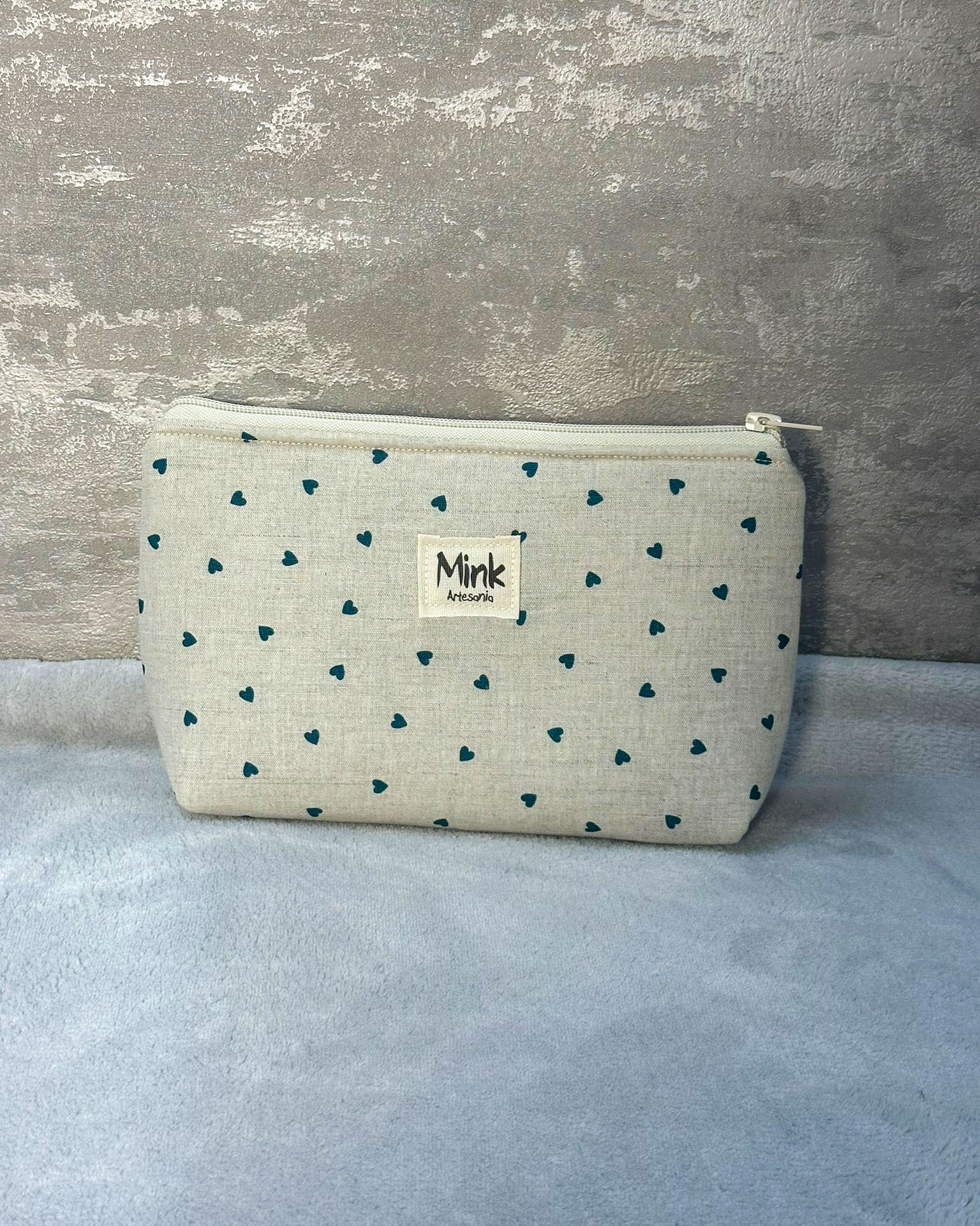 Neceser en tonos beige con estampado de corazones azul marino, elegante y versátil, ideal para mantener tus esenciales siempre organizados. Fabricado de manera artesanal con materiales resistentes y de fácil limpieza. Su tamaño compacto permite llevarlo cómodamente en cualquier bolso o maleta. Perfecto para viajes, gimnasio o uso diario.