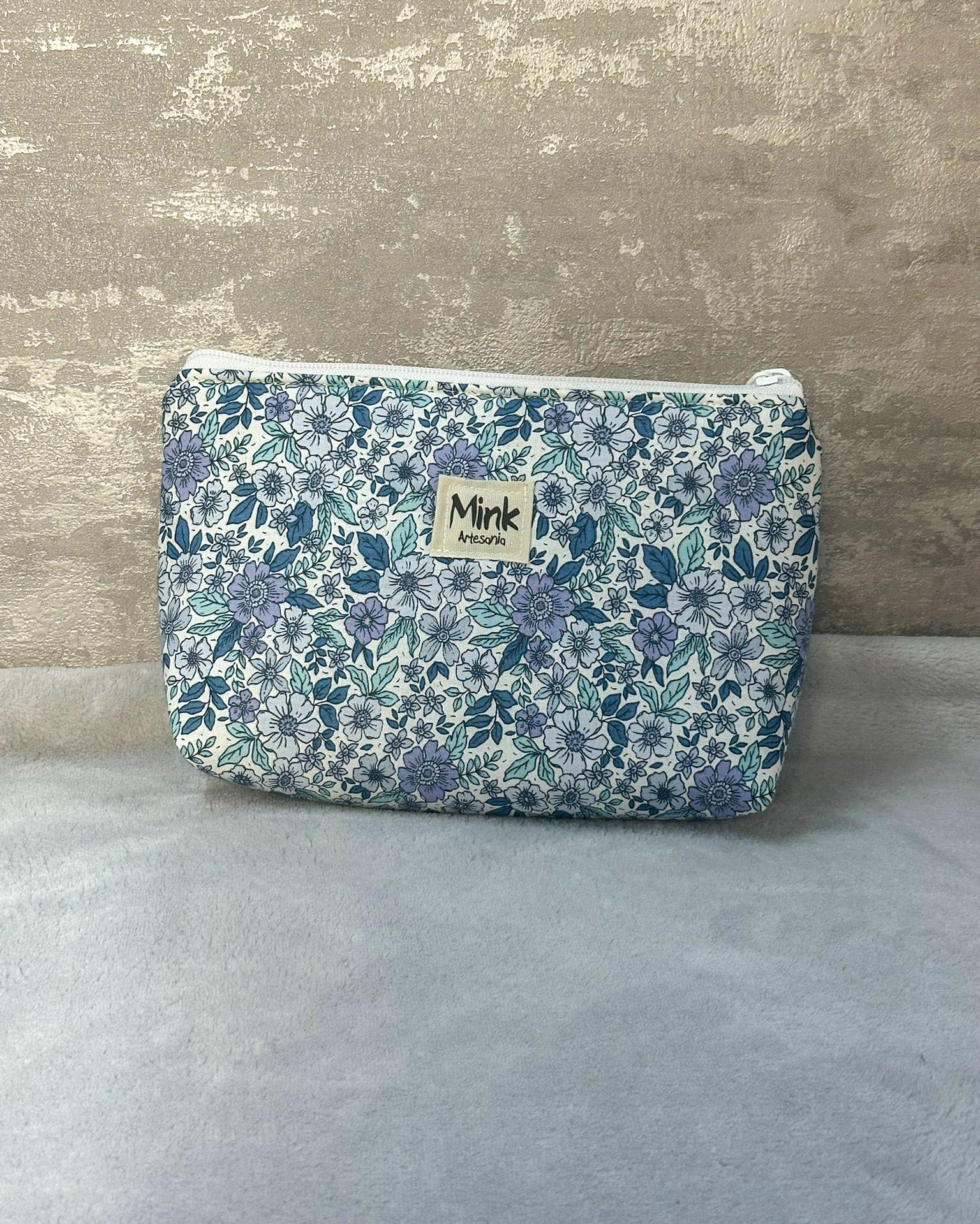 Neceser en tonos azules con motivos florales, elegante y versátil, ideal para mantener tus esenciales siempre organizados. Fabricado de manera artesanal con materiales resistentes y de fácil limpieza. Su tamaño compacto permite llevarlo cómodamente en cualquier bolso o maleta. Perfecto para viajes, gimnasio o uso diario.