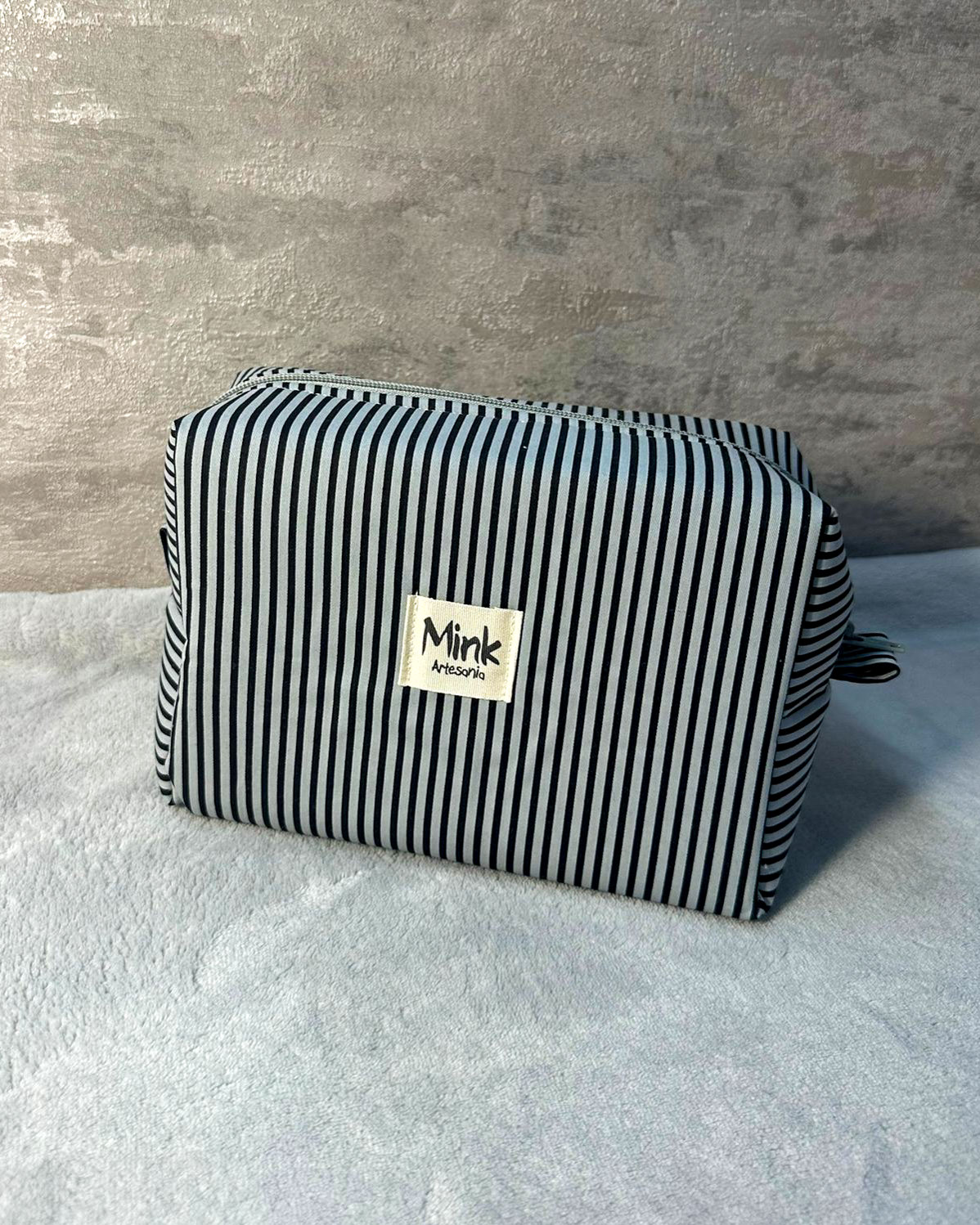 Neceser rayado en tonos bicolor beige y negro, elegante y versátil, ideal para mantener tus esenciales siempre organizados. Fabricado con materiales resistentes y de fácil limpieza. Su tamaño compacto permite llevarlo cómodamente en cualquier bolso o maleta. Perfecto para viajes, gimnasio o uso diario.